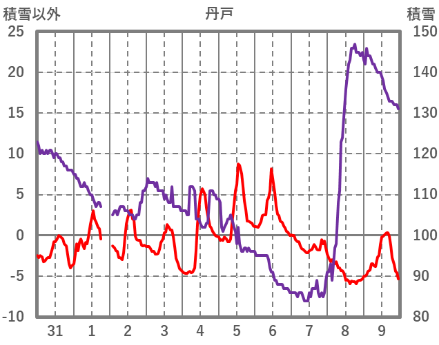 | 日 | 時 | 気温 | 降水 | 風向/風速 | 日照 | 積雪 | 降雪 |