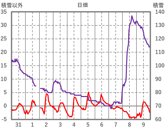 | 日 | 時 | 気温 | 降水 | 風向/風速 | 日照 | 積雪 | 降雪 |