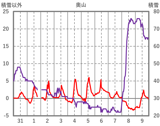 | 日 | 時 | 気温 | 降水 | 風向/風速 | 日照 | 積雪 | 降雪 |