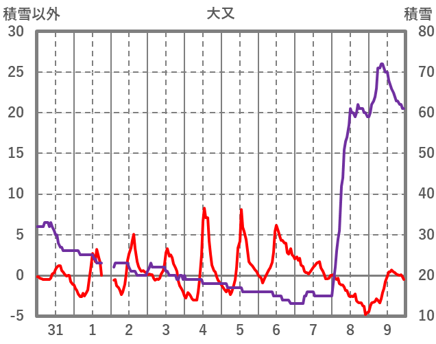 | 日 | 時 | 気温 | 降水 | 風向/風速 | 日照 | 積雪 | 降雪 |