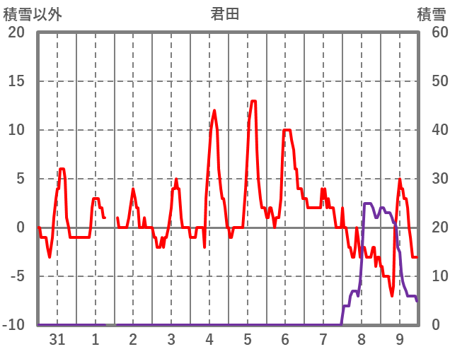 | 日 | 時 | 気温 | 降水 | 風向/風速 | 日照 | 積雪 | 降雪 |