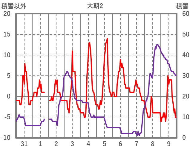 | 日 | 時 | 気温 | 降水 | 風向/風速 | 日照 | 積雪 | 降雪 |