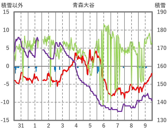 | 日 | 時 | 気温 | 降水 | 風向/風速 | 日照 | 積雪 | 降雪 |