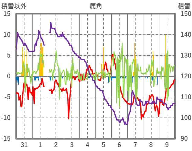 | 日 | 時 | 気温 | 降水 | 風向/風速 | 日照 | 積雪 | 降雪 |