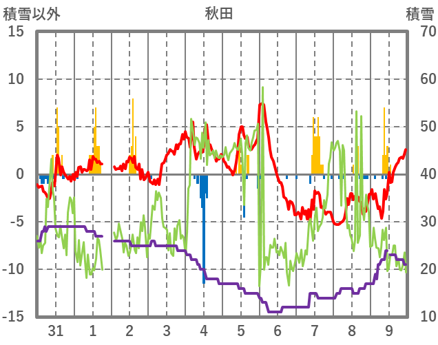 | 日 | 時 | 気温 | 降水 | 風向/風速 | 日照 | 積雪 | 降雪 |