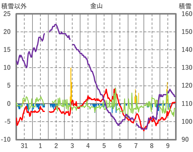 | 日 | 時 | 気温 | 降水 | 風向/風速 | 日照 | 積雪 | 降雪 |