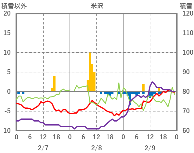 | 日 | 時 | 気温 | 降水 | 風向/風速 | 日照 | 積雪 | 降雪 |