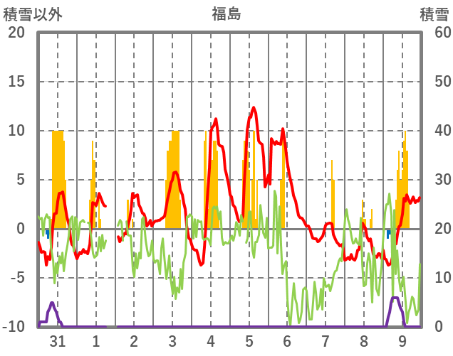 | 日 | 時 | 気温 | 降水 | 風向/風速 | 日照 | 積雪 | 降雪 |