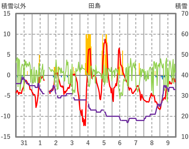 | 日 | 時 | 気温 | 降水 | 風向/風速 | 日照 | 積雪 | 降雪 |