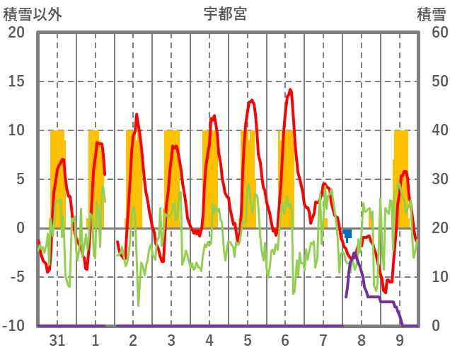| 日 | 時 | 気温 | 降水 | 風向/風速 | 日照 | 積雪 | 降雪 |