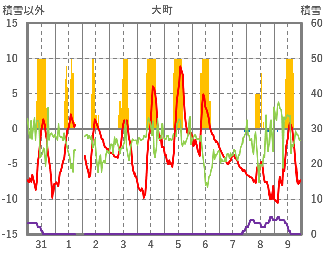 | 日 | 時 | 気温 | 降水 | 風向/風速 | 日照 | 積雪 | 降雪 |