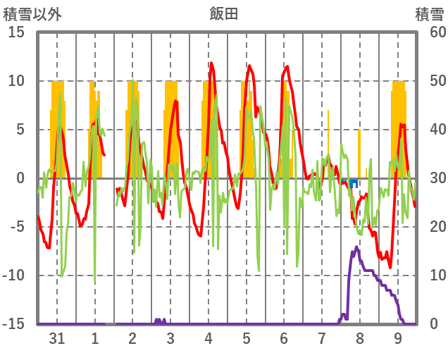 | 日 | 時 | 気温 | 降水 | 風向/風速 | 日照 | 積雪 | 降雪 |