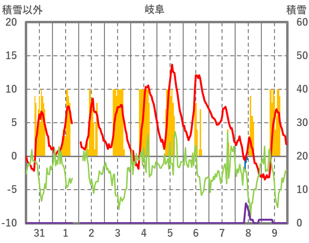 | 日 | 時 | 気温 | 降水 | 風向/風速 | 日照 | 積雪 | 降雪 |