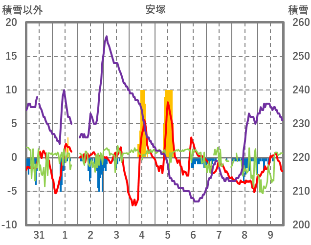| 日 | 時 | 気温 | 降水 | 風向/風速 | 日照 | 積雪 | 降雪 |