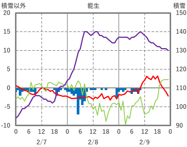 | 日 | 時 | 気温 | 降水 | 風向/風速 | 日照 | 積雪 | 降雪 |