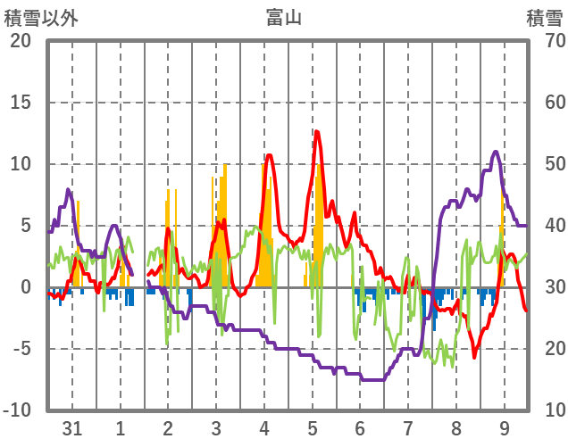 | 日 | 時 | 気温 | 降水 | 風向/風速 | 日照 | 積雪 | 降雪 |