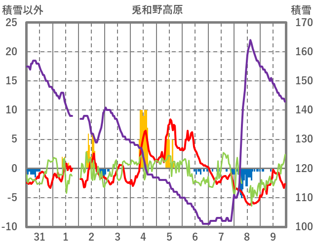 | 日 | 時 | 気温 | 降水 | 風向/風速 | 日照 | 積雪 | 降雪 |