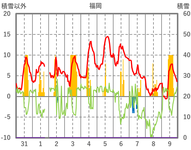 | 日 | 時 | 気温 | 降水 | 風向/風速 | 日照 | 積雪 | 降雪 |