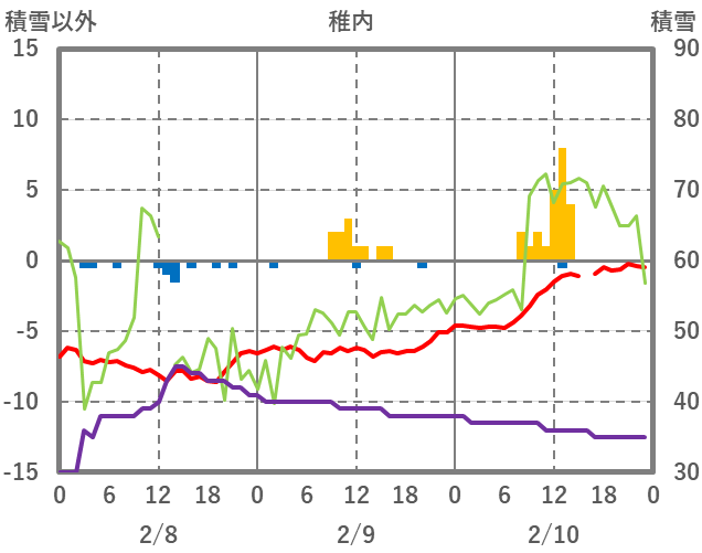 | 日 | 時 | 気温 | 降水 | 風向/風速 | 日照 | 積雪 | 降雪 |