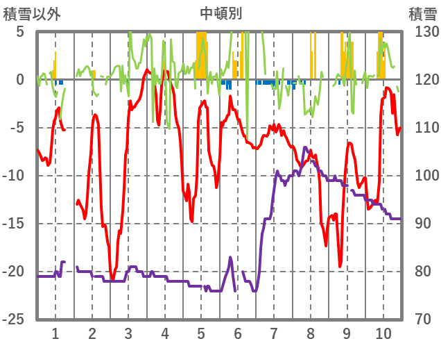 | 日 | 時 | 気温 | 降水 | 風向/風速 | 日照 | 積雪 | 降雪 |