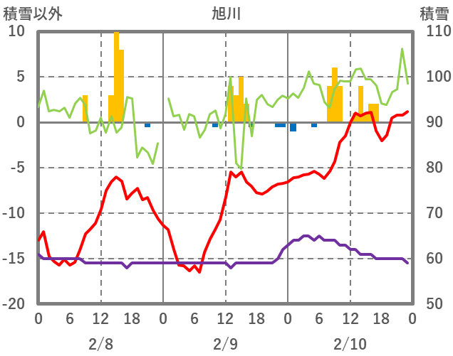 | 日 | 時 | 気温 | 降水 | 風向/風速 | 日照 | 積雪 | 降雪 |