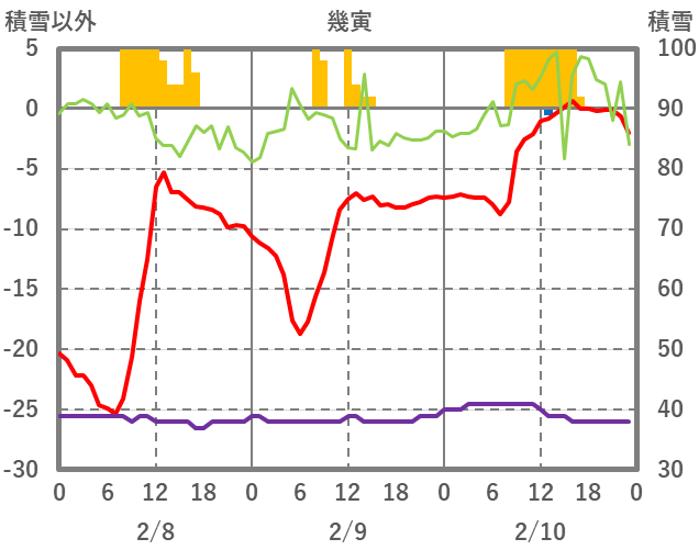 | 日 | 時 | 気温 | 降水 | 風向/風速 | 日照 | 積雪 | 降雪 |