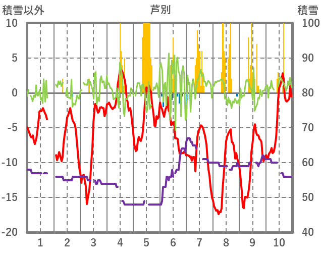 | 日 | 時 | 気温 | 降水 | 風向/風速 | 日照 | 積雪 | 降雪 |