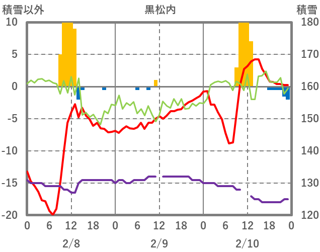 | 日 | 時 | 気温 | 降水 | 風向/風速 | 日照 | 積雪 | 降雪 |