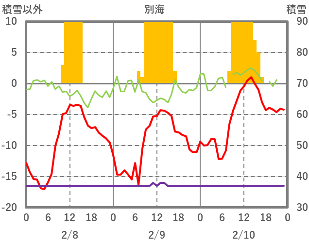 | 日 | 時 | 気温 | 降水 | 風向/風速 | 日照 | 積雪 | 降雪 |