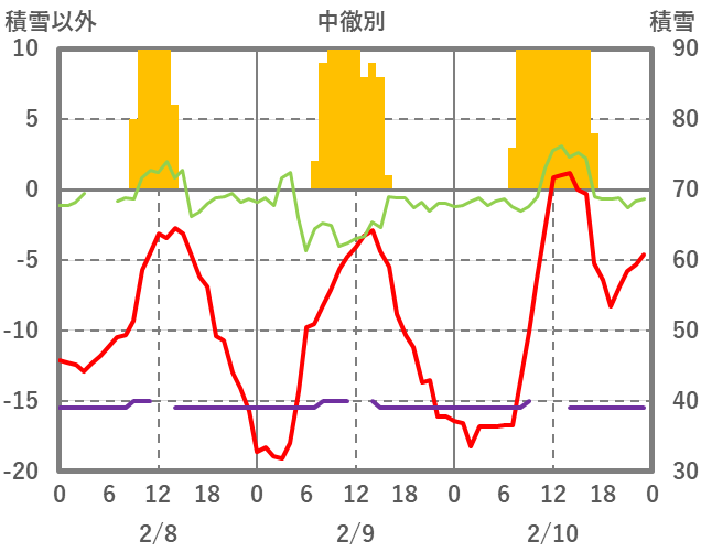 | 日 | 時 | 気温 | 降水 | 風向/風速 | 日照 | 積雪 | 降雪 |