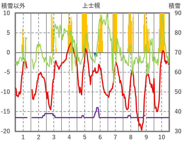 | 日 | 時 | 気温 | 降水 | 風向/風速 | 日照 | 積雪 | 降雪 |