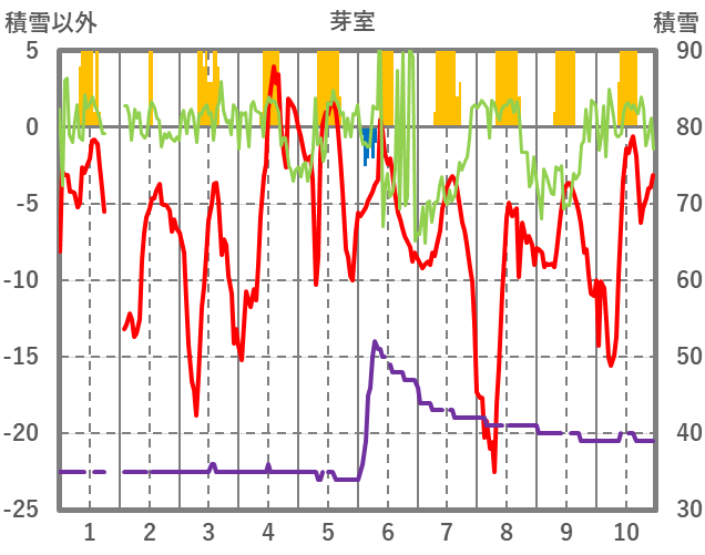 | 日 | 時 | 気温 | 降水 | 風向/風速 | 日照 | 積雪 | 降雪 |