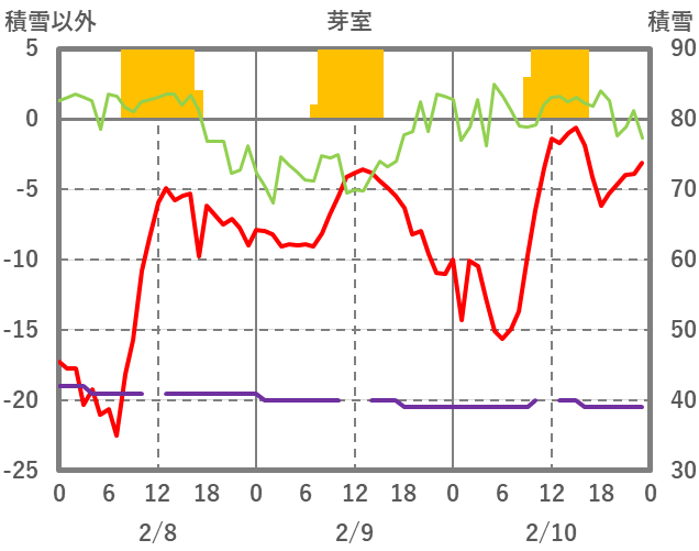 | 日 | 時 | 気温 | 降水 | 風向/風速 | 日照 | 積雪 | 降雪 |