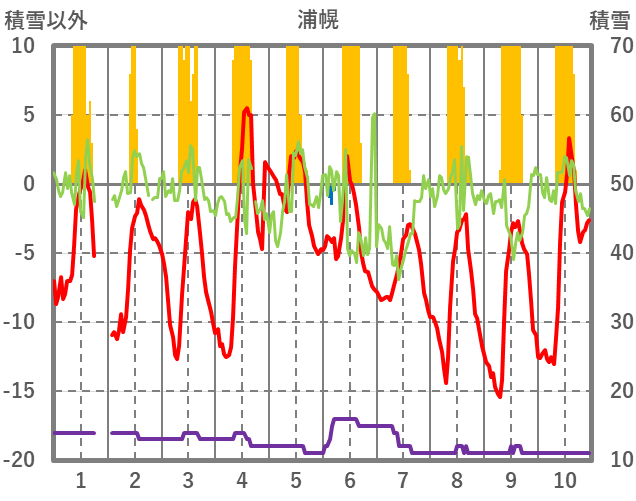 | 日 | 時 | 気温 | 降水 | 風向/風速 | 日照 | 積雪 | 降雪 |