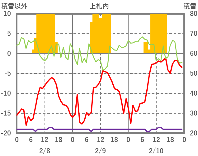 | 日 | 時 | 気温 | 降水 | 風向/風速 | 日照 | 積雪 | 降雪 |