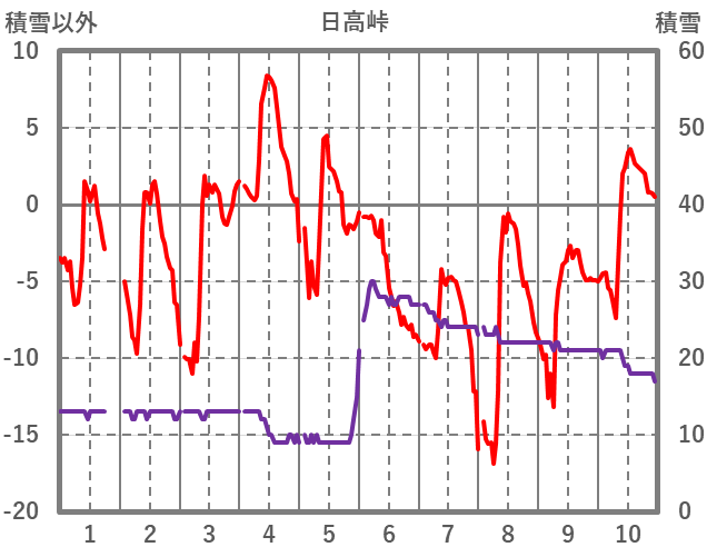 | 日 | 時 | 気温 | 降水 | 風向/風速 | 日照 | 積雪 | 降雪 |