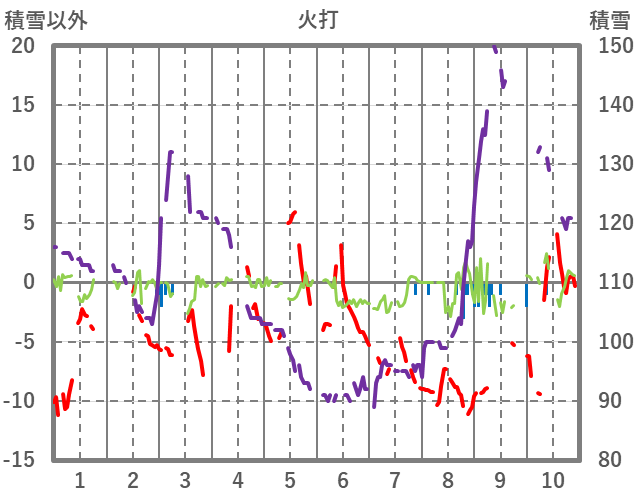 | 日 | 時 | 気温 | 降水 | 風向/風速 | 日照 | 積雪 | 降雪 |