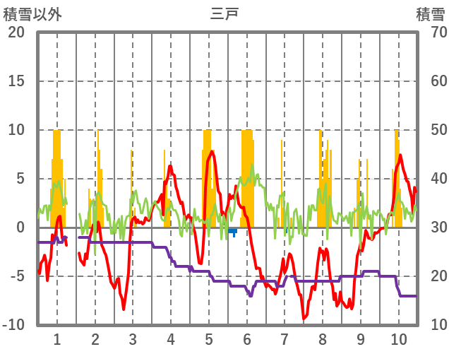 | 日 | 時 | 気温 | 降水 | 風向/風速 | 日照 | 積雪 | 降雪 |