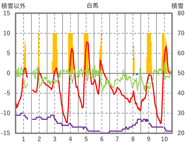 | 日 | 時 | 気温 | 降水 | 風向/風速 | 日照 | 積雪 | 降雪 |