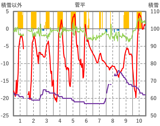| 日 | 時 | 気温 | 降水 | 風向/風速 | 日照 | 積雪 | 降雪 |