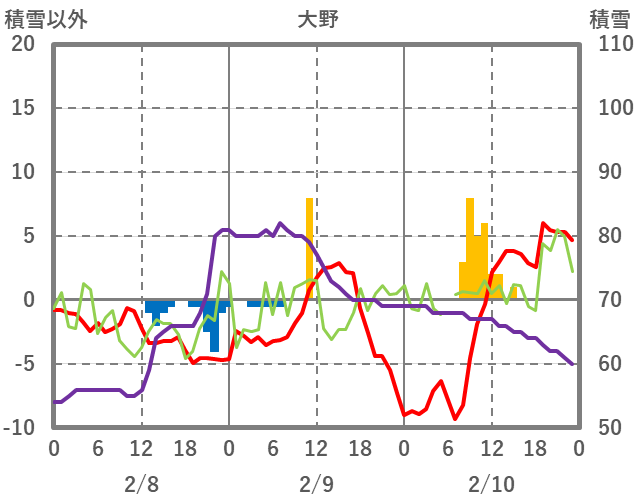 | 日 | 時 | 気温 | 降水 | 風向/風速 | 日照 | 積雪 | 降雪 |