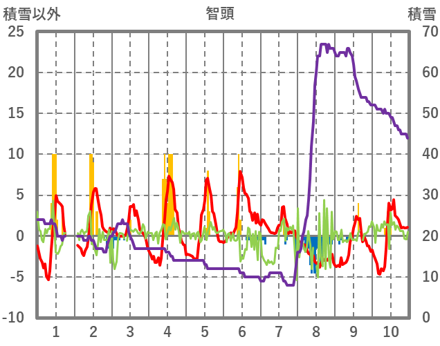 | 日 | 時 | 気温 | 降水 | 風向/風速 | 日照 | 積雪 | 降雪 |