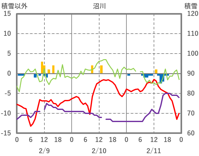 | 日 | 時 | 気温 | 降水 | 風向/風速 | 日照 | 積雪 | 降雪 |