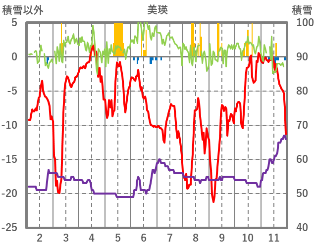 | 日 | 時 | 気温 | 降水 | 風向/風速 | 日照 | 積雪 | 降雪 |