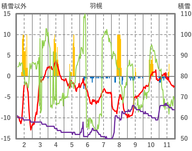 | 日 | 時 | 気温 | 降水 | 風向/風速 | 日照 | 積雪 | 降雪 |