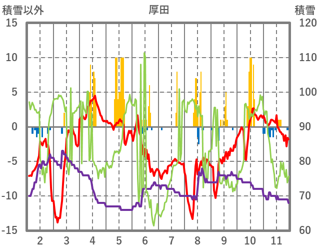 | 日 | 時 | 気温 | 降水 | 風向/風速 | 日照 | 積雪 | 降雪 |