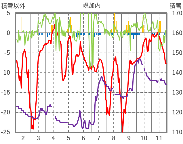 | 日 | 時 | 気温 | 降水 | 風向/風速 | 日照 | 積雪 | 降雪 |
