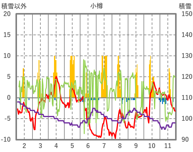 | 日 | 時 | 気温 | 降水 | 風向/風速 | 日照 | 積雪 | 降雪 |