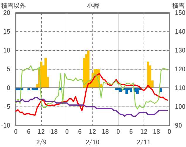 | 日 | 時 | 気温 | 降水 | 風向/風速 | 日照 | 積雪 | 降雪 |