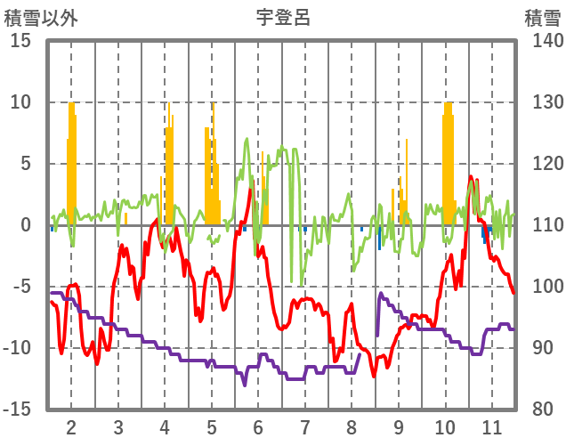 | 日 | 時 | 気温 | 降水 | 風向/風速 | 日照 | 積雪 | 降雪 |